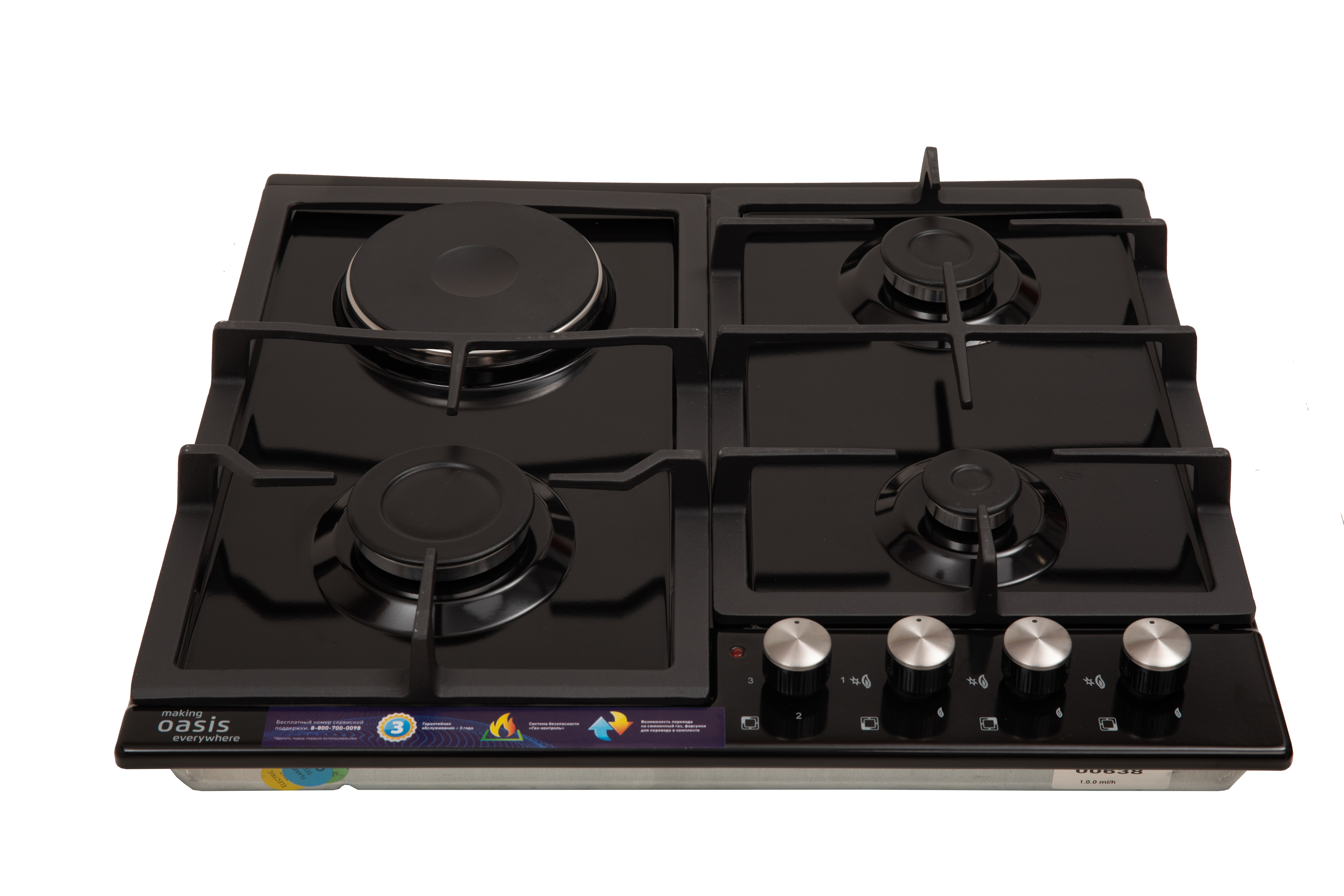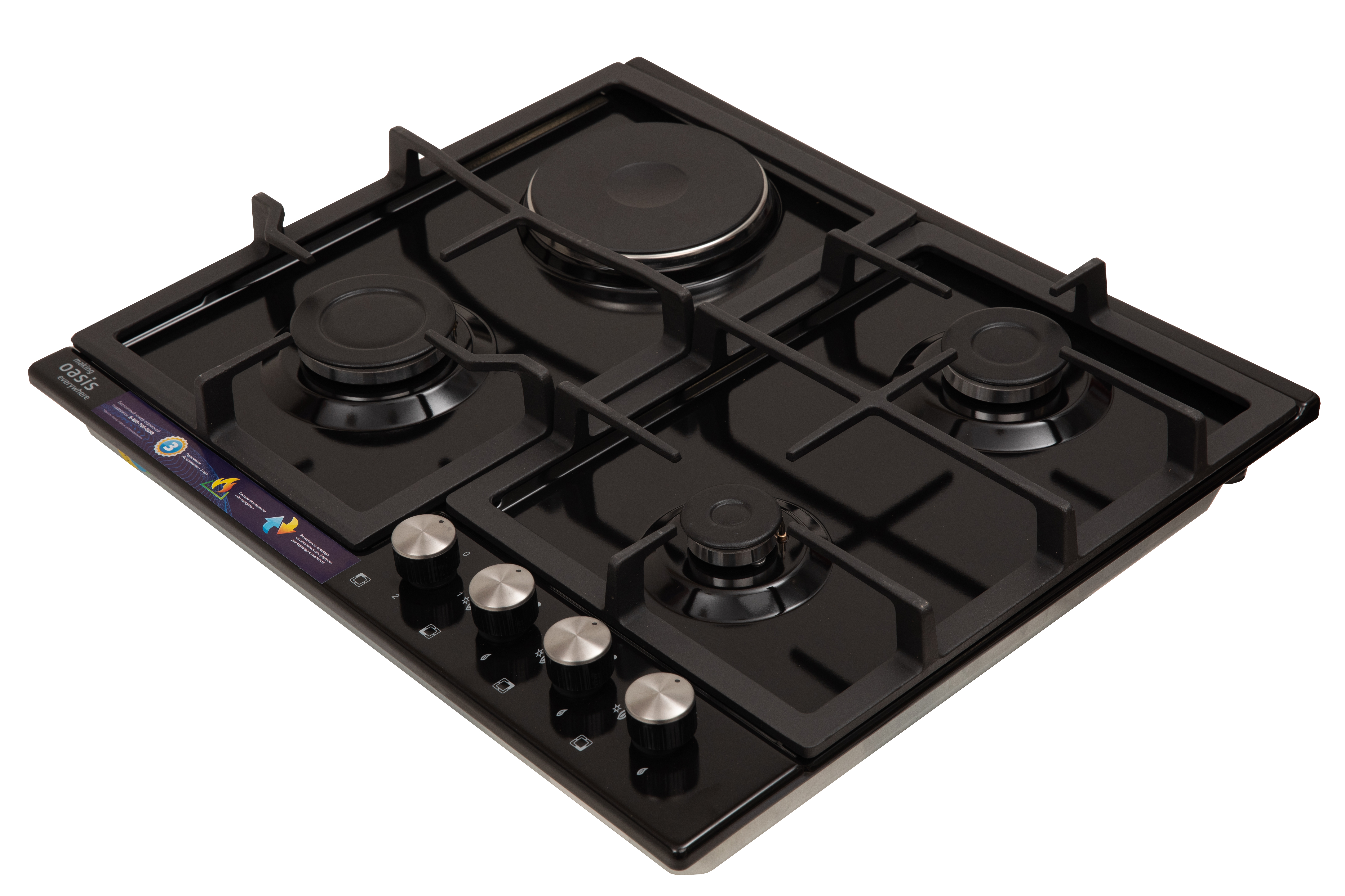 Описаниеповерхность комбинированная независимая, 60 см, 4 конфорки ( 3 - газовых, 1 - электрическая), решетки чугунные, черный