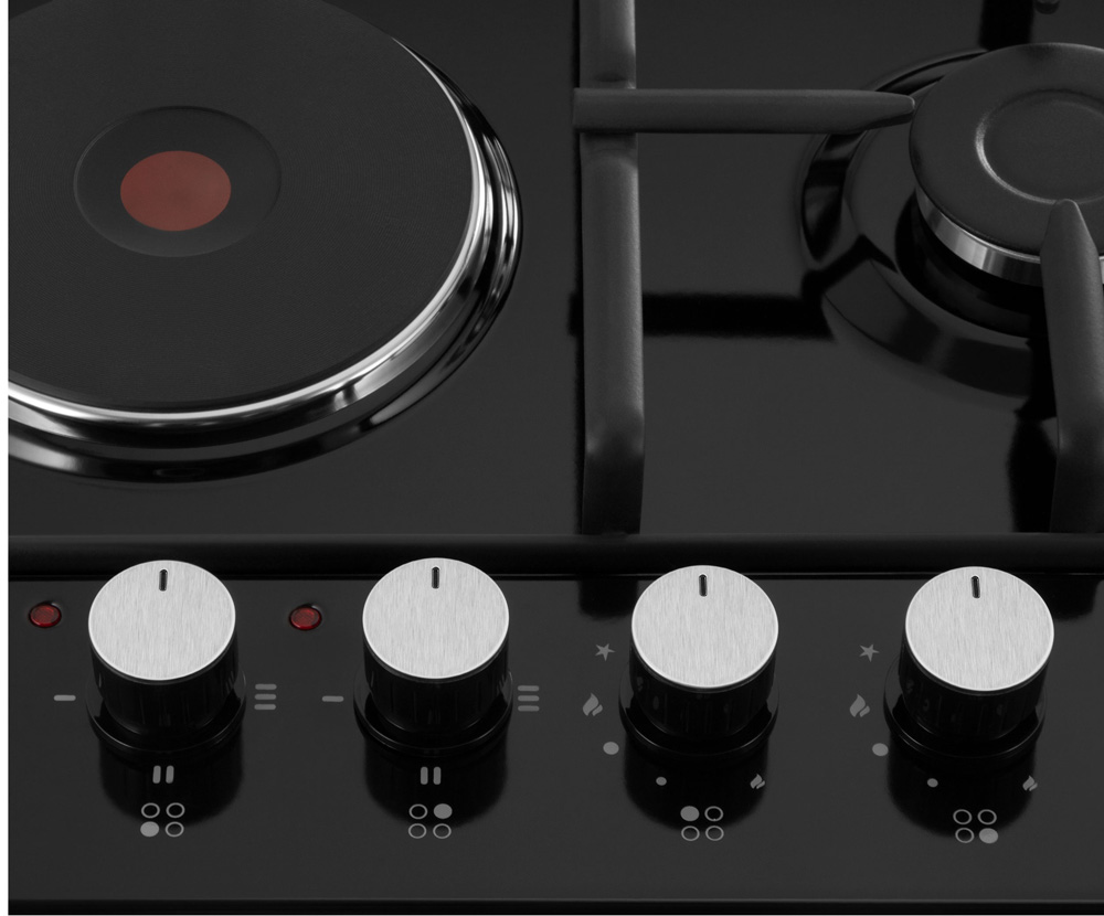 Описаниеповерхность комбинированная независимая, 60 см, 4 конфорки ( 2 - газовых, 2 - электрических), чугунные решетки, черный