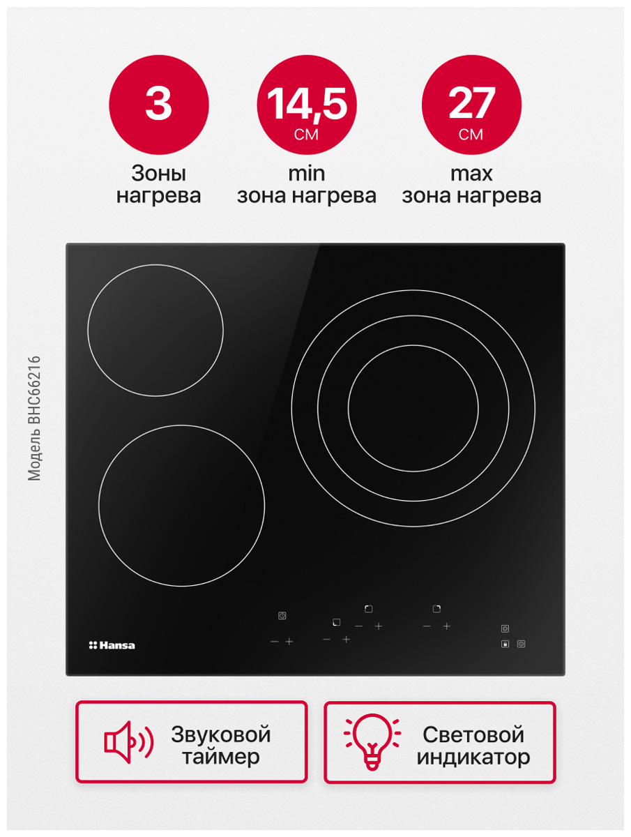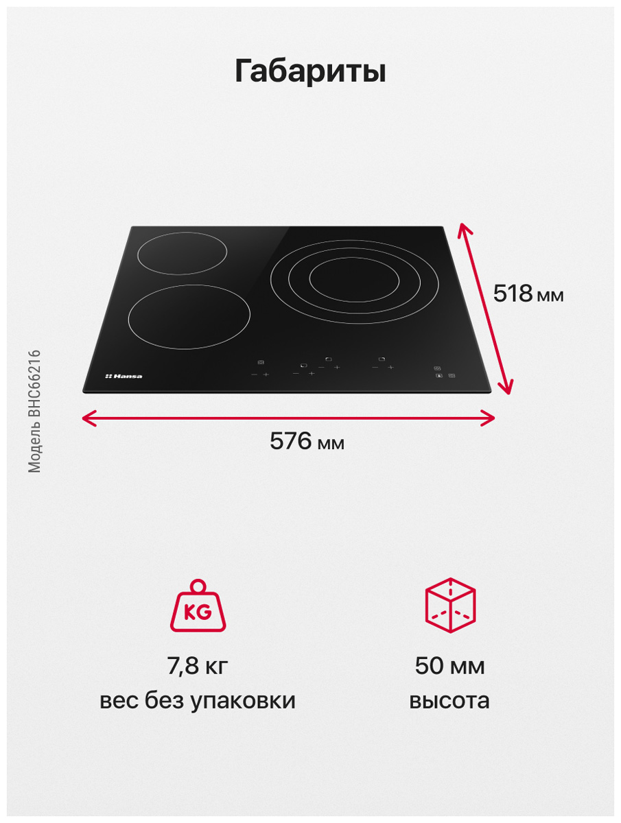Размер (Высота) 4,8 см Размер (Глубина) 52,2 см Размер (Ширина) 59,2 см Цвет черный Ширина прибора 60 см Переключатели сенсорные Управление сенсорное Таймер есть Защита от детей есть Мощность подключения, Вт 5700 Фурнитура нет Гарантийный срок (месяцы) 12 Страна производитель Польша Ссылка на сайт производителя https://hansa.ru/product/keramicheskaya-varochnaya-poverhnost-hansa-bhc66216 Всего конфорок 3 Рабочая поверхность стеклокерамика Тип поверхности стеклокерамическая (Hi Light) Встроенная вытяжка нет Расположение панели управления спереди Зона расширения трёхконтурная Функция Booster нет Дизайн рамки без рамки Размер в упаковке (Высота) 12,5 см Размер в упаковке (Ширина) 70 см Размер в упаковке (Глубина) 60 см Вес прибора 8 кг Размер (Ширина), см 59,2 Размер (Высота), см (Общие) 4,8 Размер (Глубина), см 52,2 - Отзывы