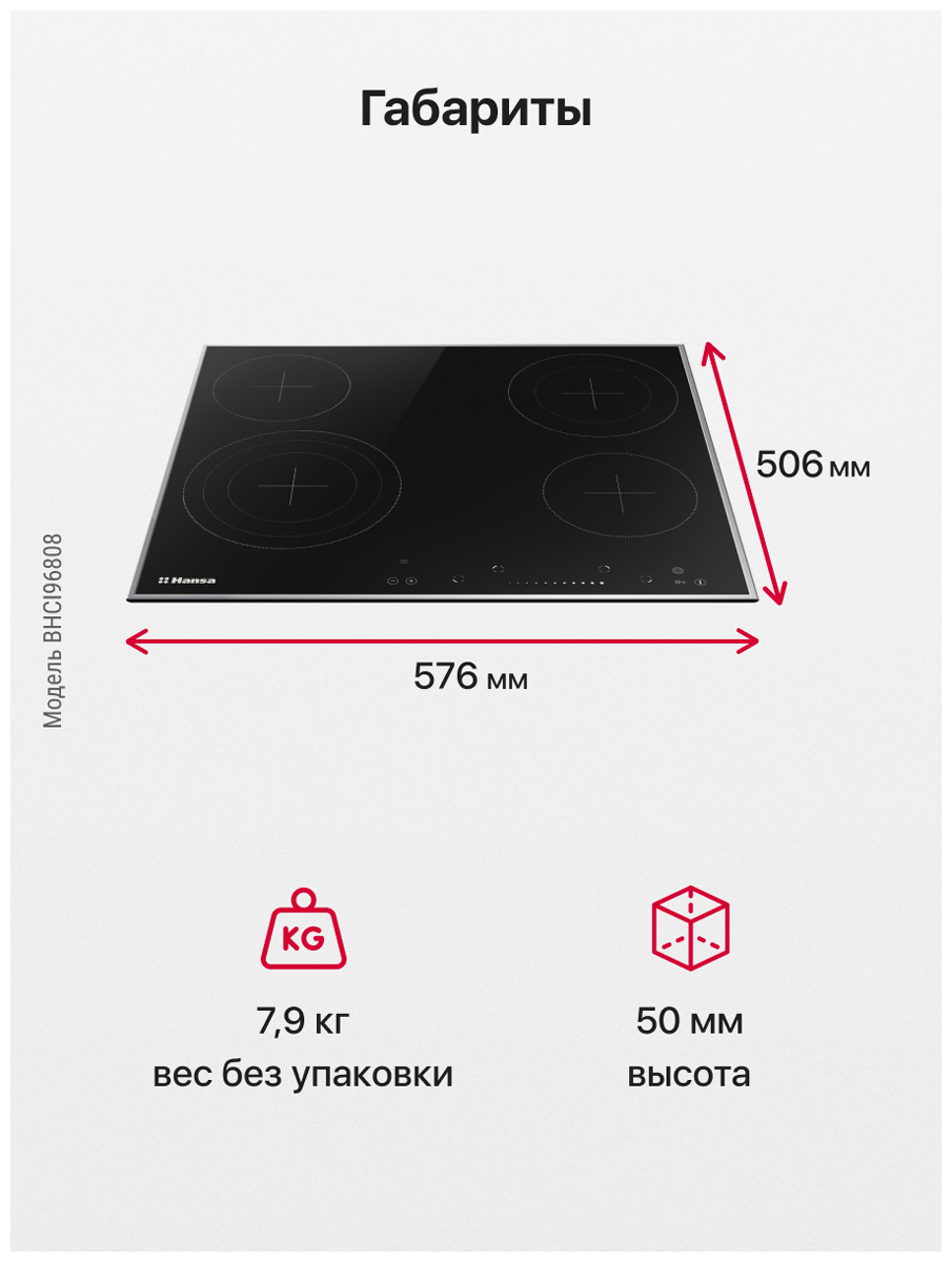 Размер (Высота) 5 см Размер (Глубина) 50,6 см Размер (Ширина) 57,6 см Цвет черный Ширина прибора 60 см Переключатели сенсорные Управление сенсорное Таймер есть Защита от детей есть Мощность подключения, Вт 6400 Фурнитура нержавеющая сталь Гарантийный срок (месяцы) 12 Страна производитель Польша Ссылка на сайт производителя https://www.hansa.ru/catalog/varochnye_poverkhnosti/bhci96808/?ysclid=lc92d3cj40651673713 Всего конфорок 4 Рабочая поверхность стеклокерамика Тип поверхности стеклокерамическая (Hi Light) Встроенная вытяжка нет Расположение панели управления спереди Зона расширения двухконтурная, трёхконтурная Функция Booster нет Дизайн рамки металлическая рамка Размер в упаковке (Высота) 12,5 см Размер в упаковке (Ширина) 70 см Размер в упаковке (Глубина) 60 см Вес прибора 7,95 кг Размер (Ширина), см 57,6 Размер (Высота), см (Общие) 5 Размер (Глубина), см 50,6 - Отзывы