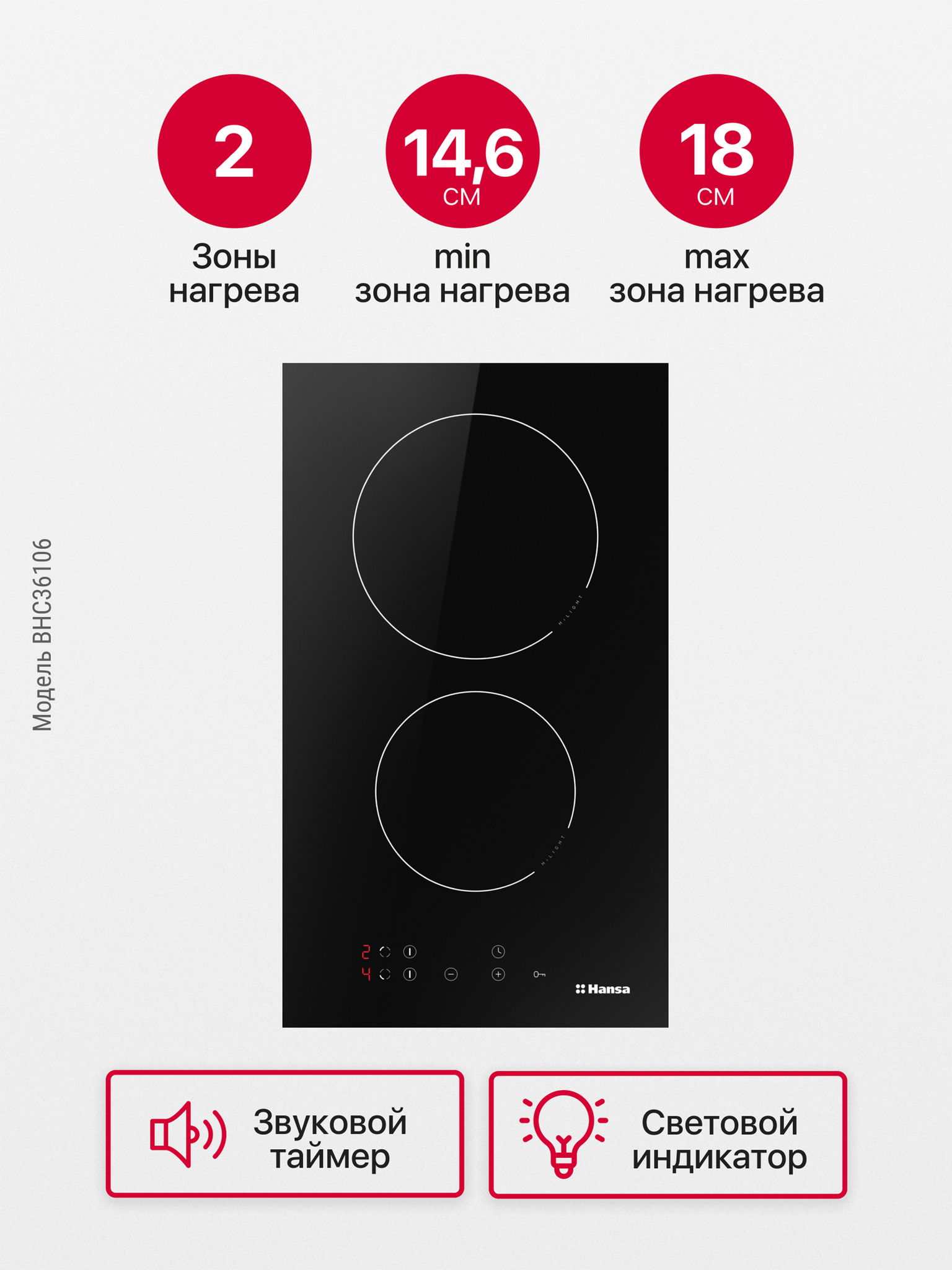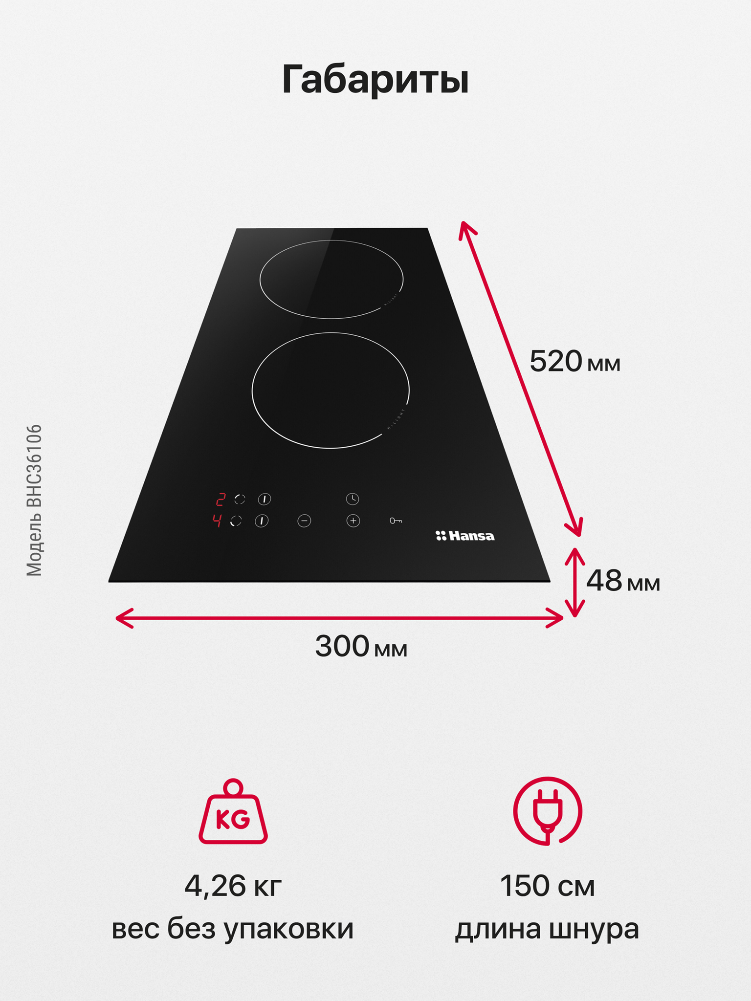 Размер (Высота) 4,8 см Размер (Глубина) 52 см Размер (Ширина) 30 см Цвет черный Ширина прибора 30 см Переключатели сенсорные Управление сенсорное Таймер есть Защита от детей есть Мощность подключения, Вт 6300 Фурнитура нет Гарантийный срок (месяцы) 12 Страна производитель Польша Ссылка на сайт производителя https://hansa.ru/product/steklokeramicheskaya-varochnaya-poverhnost-hansa-bhc36106-chernyy Всего конфорок 2 Рабочая поверхность стеклокерамика Тип поверхности стеклокерамическая (Hi Light) Встроенная вытяжка нет Расположение панели управления спереди Зона расширения нет Функция Booster нет Дизайн рамки без рамки Размер в упаковке (Высота) 12,5 см Размер в упаковке (Ширина) 41 см Размер в упаковке (Глубина) 61 см Вес прибора 4,55 кг Размер (Ширина), см 30 Размер (Высота), см (Общие) 4,8 Размер (Глубина), см 52 - Отзывы