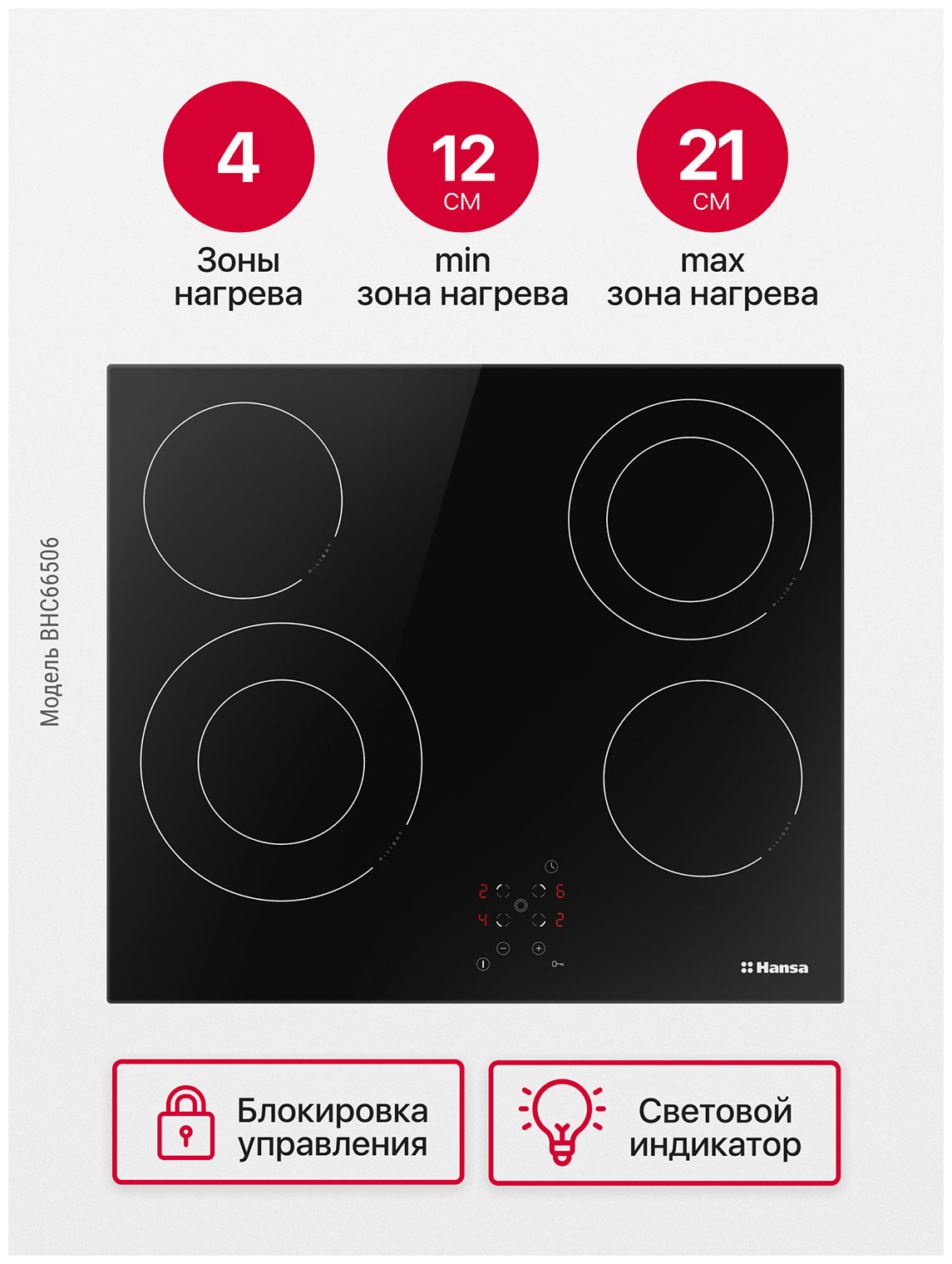 Размер (Высота) 5 см Размер (Глубина) 51,8 см Размер (Ширина) 57,6 см Цвет черный Ширина прибора 60 см Переключатели сенсорные Управление сенсорное Таймер есть Защита от детей есть Мощность подключения, Вт 6300 Фурнитура нет Гарантийный срок (месяцы) 12 Страна производитель Польша Ссылка на сайт производителя https://hansa.ru/product/steklokeramicheskaya-varochnaya-poverhnost-hansa-bhc66506-chernyy Всего конфорок 4 Рабочая поверхность стеклокерамика Тип поверхности стеклокерамическая (Hi Light) Встроенная вытяжка нет Расположение панели управления спереди Зона расширения двухконтурная, 2 Функция Booster нет Дизайн рамки без рамки Размер в упаковке (Высота) 12,5 см Размер в упаковке (Ширина) 70 см Размер в упаковке (Глубина) 60 см Вес прибора 7,65 кг Размер (Ширина), см 57,6 Размер (Высота), см (Общие) 5 Размер (Глубина), см 51,8 - Отзывы