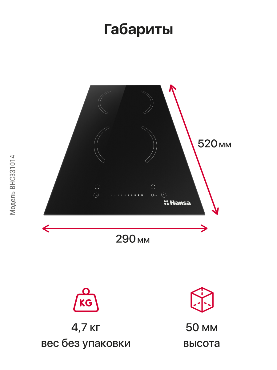 Размер (Высота) 5 см Размер (Глубина) 52 см Размер (Ширина) 29 см Цвет черный Ширина прибора 30 см Переключатели сенсорные Управление сенсорное Таймер есть Защита от детей есть Мощность подключения, Вт 3000 Фурнитура нет Гарантийный срок (месяцы) 12 Страна производитель Китай Ссылка на сайт производителя https://hansa.ru/product/elektricheskaya-varochnaya-panel-hansa-bhc331014 Всего конфорок 2 Рабочая поверхность стеклокерамика Тип поверхности стеклокерамическая (Hi Light) Встроенная вытяжка нет Расположение панели управления спереди Зона расширения нет Функция Booster нет Дизайн рамки без рамки Размер в упаковке (Высота) 11,5 см Размер в упаковке (Ширина) 37,5 см Размер в упаковке (Глубина) 58 см Вес прибора 4,7 кг Размер (Ширина), см 29 Размер (Высота), см (Общие) 5 Размер (Глубина), см 52 - Отзывы