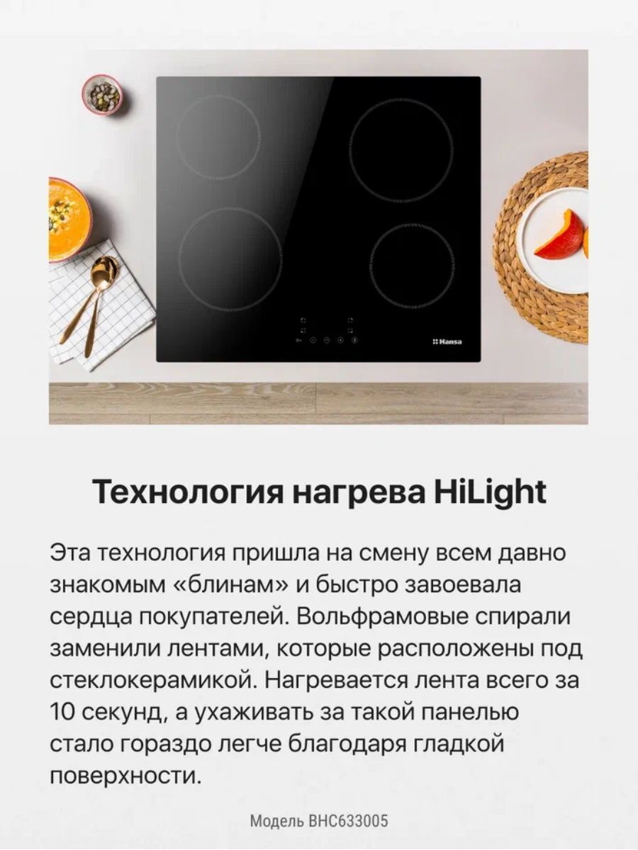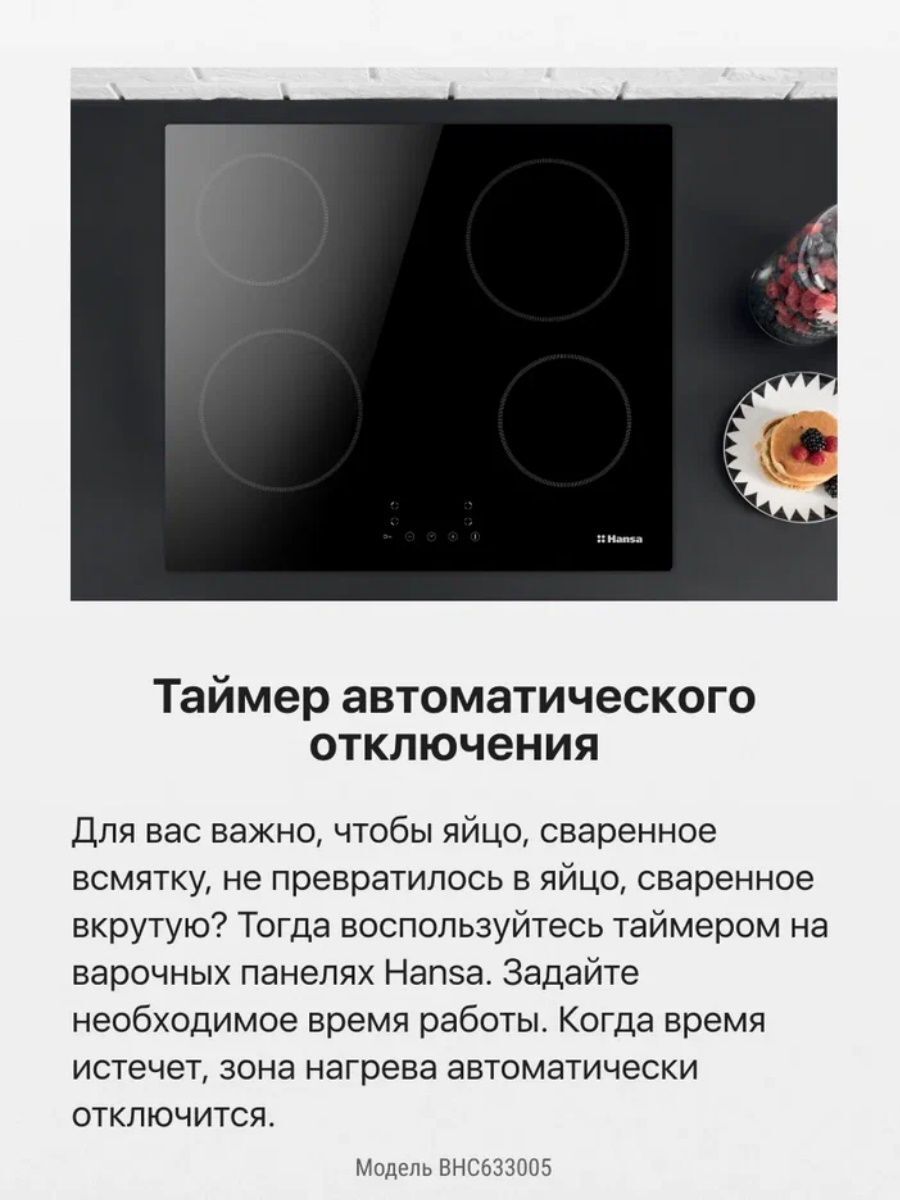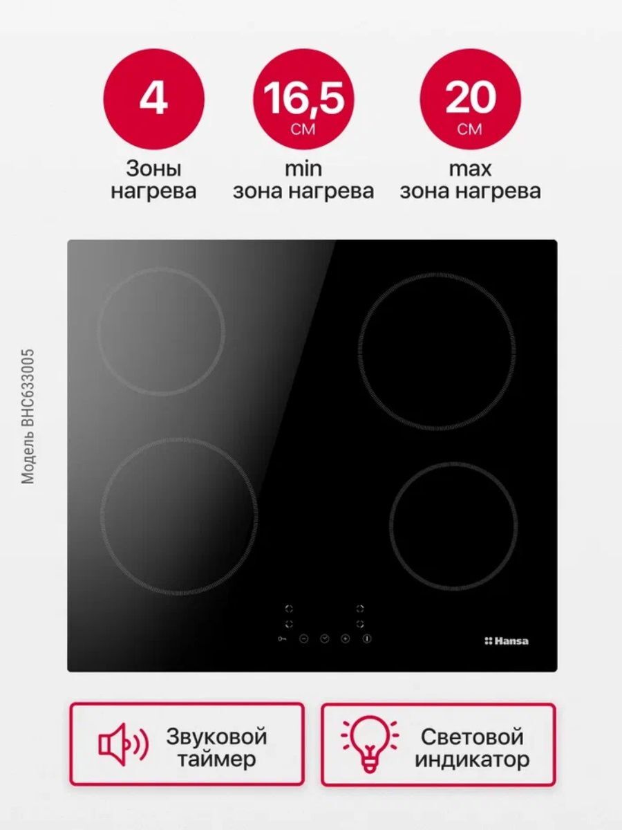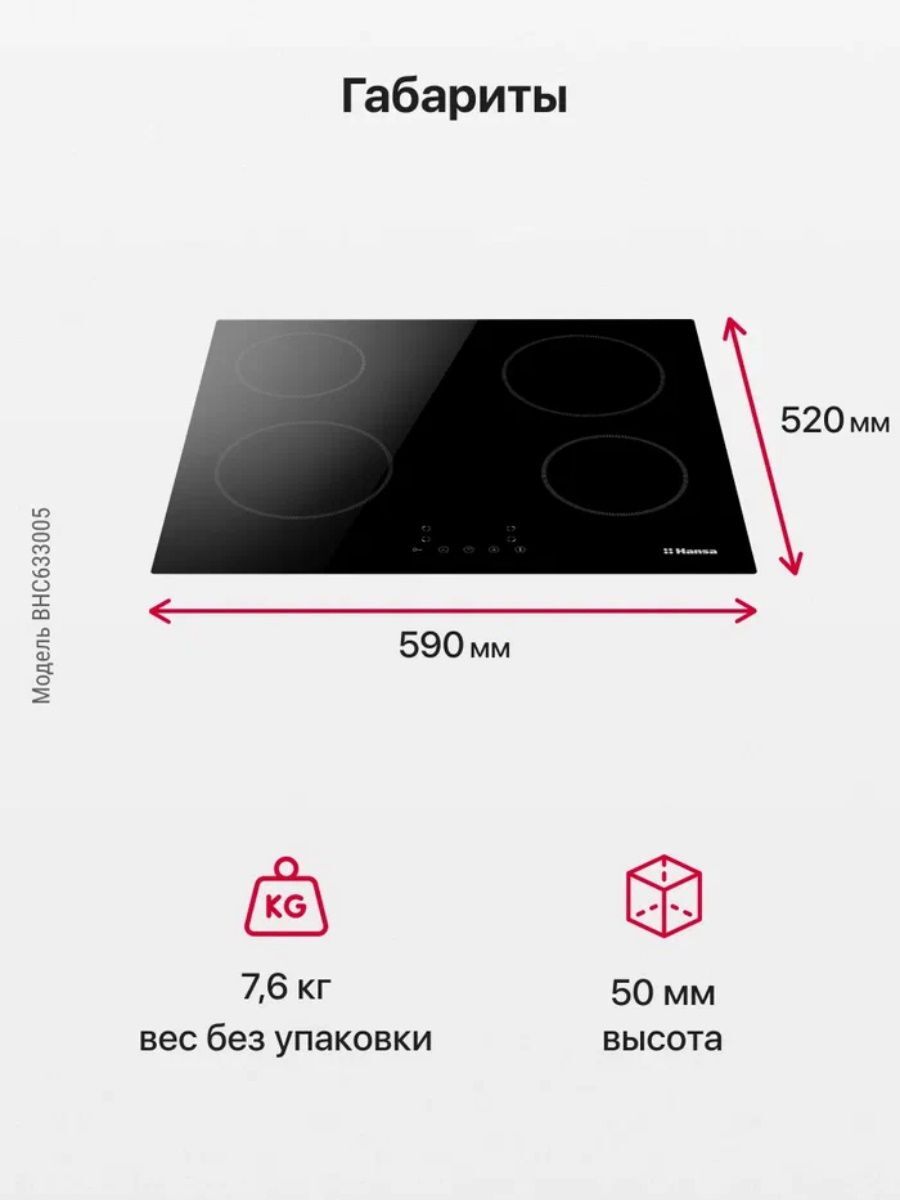 Размер (Высота) 5 см Размер (Глубина) 52 см Размер (Ширина) 59 см Цвет черный Ширина прибора 60 см Переключатели сенсорные Управление сенсорное Таймер есть Защита от детей есть Мощность подключения, Вт 6000 Фурнитура нет Гарантийный срок (месяцы) 12 Страна производитель Китай Ссылка на сайт производителя https://hansa.ru/product/elektricheskaya-varochnaya-poverhnost-hansa-bhc633005-chernyy Всего конфорок 4 Рабочая поверхность стеклокерамика Тип поверхности стеклокерамическая (Hi Light) Встроенная вытяжка нет Расположение панели управления спереди Зона расширения нет Функция Booster нет Дизайн рамки без рамки Размер в упаковке (Высота) 11,5 см Размер в упаковке (Ширина) 65 см Размер в упаковке (Глубина) 58 см Вес прибора 8,8 кг Размер (Ширина), см 59 Размер (Высота), см (Общие) 5 Размер (Глубина), см 52 - Отзывы
