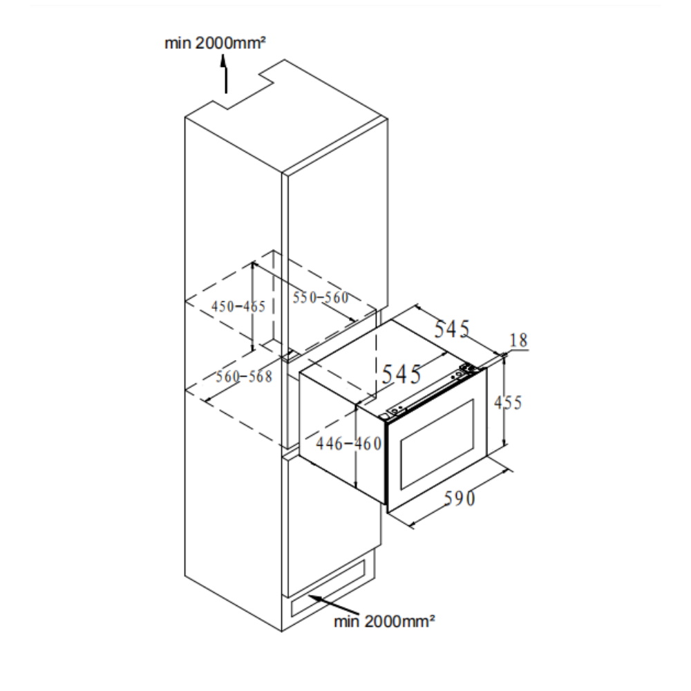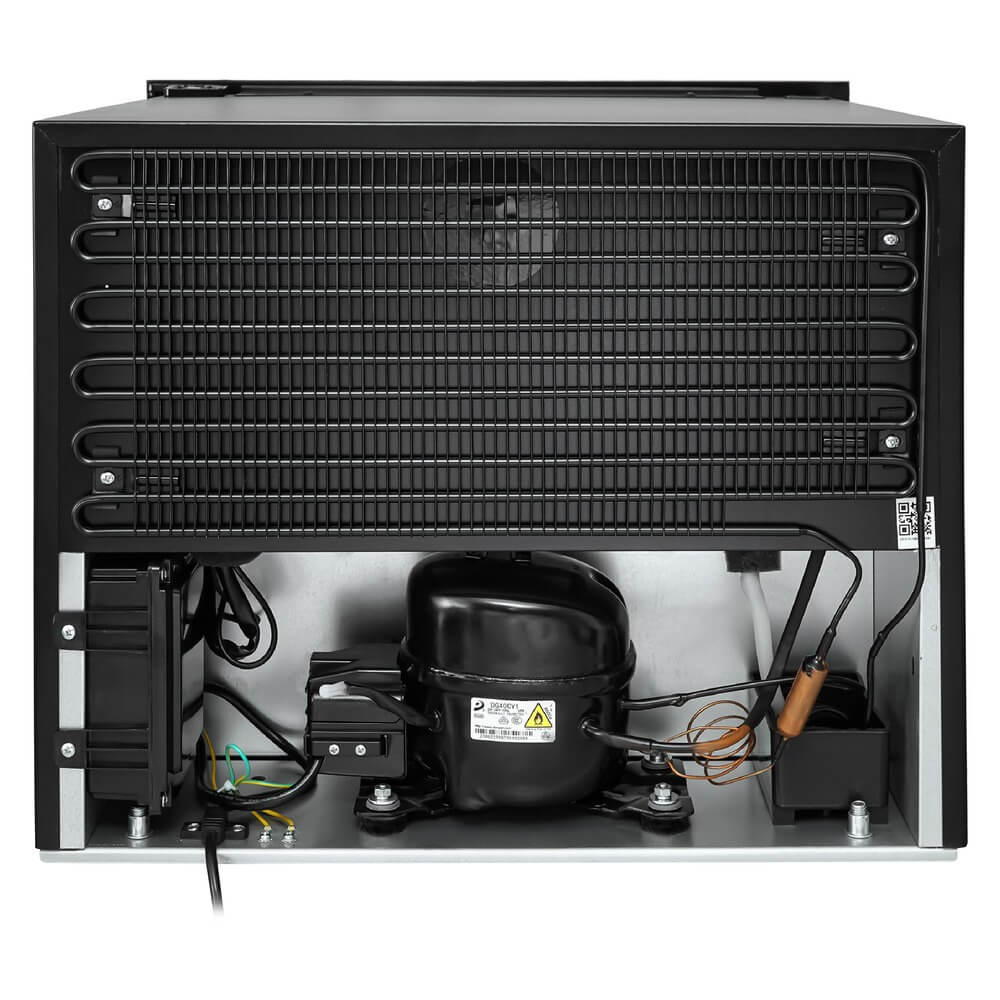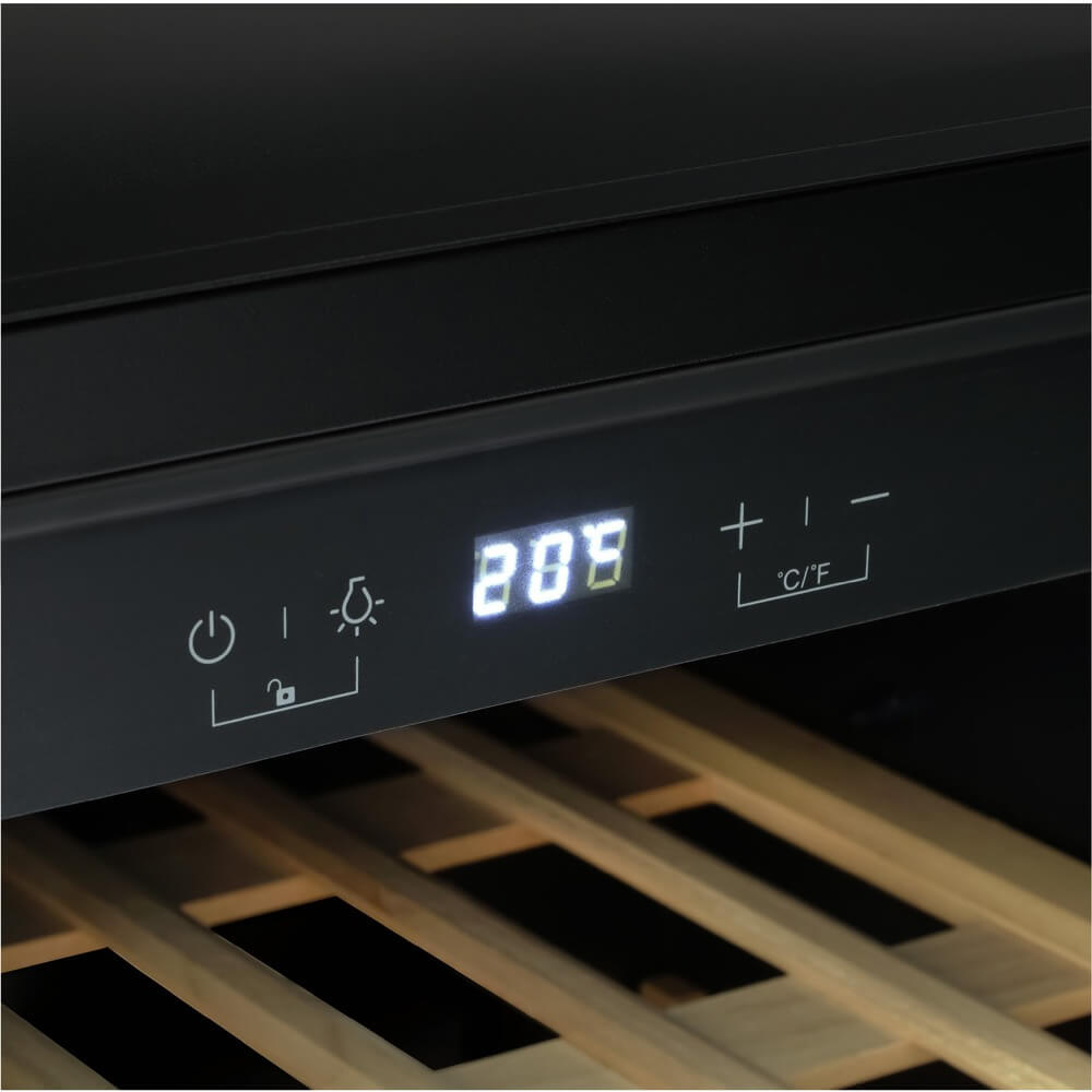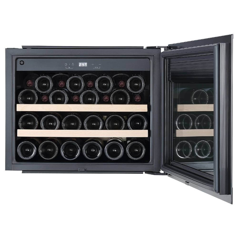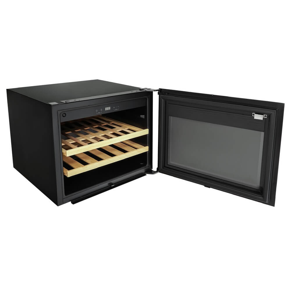 Описаниевинный шкаф встраиваемый, 62 л, 59х56,3х45,5 см, черное стекло + черная нержавеющая сталь