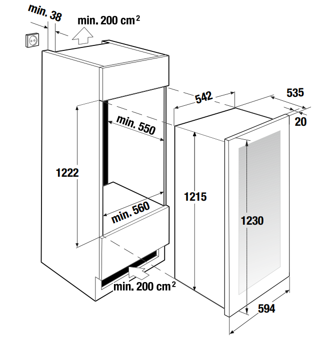 Описаниевинный шкаф встраиваемый, 79 бутылок, 59,4х55,5х123 см, ручка черная
