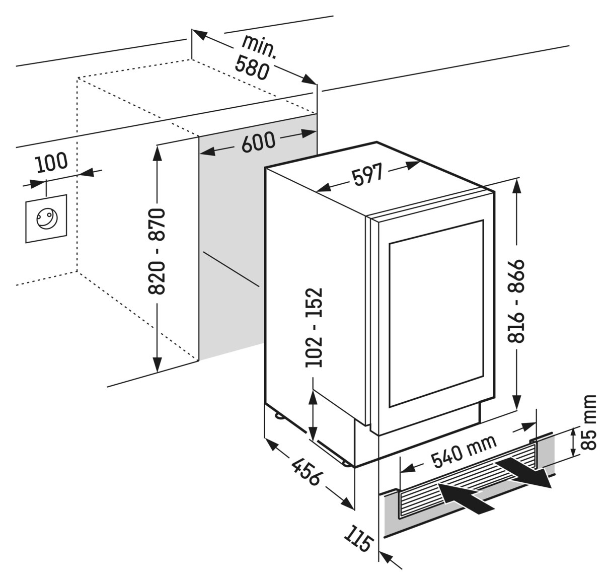 Описаниевинный шкаф встраиваемый, 94 л, класс энергопотребления А, 59,7x57,7x81,8 см, черный/серебристый