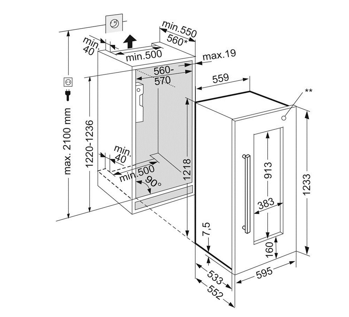 Описаниевинный шкаф встраиваемый, 158 л, класс энергопотребления А, 55,7х55,3х121,8 см